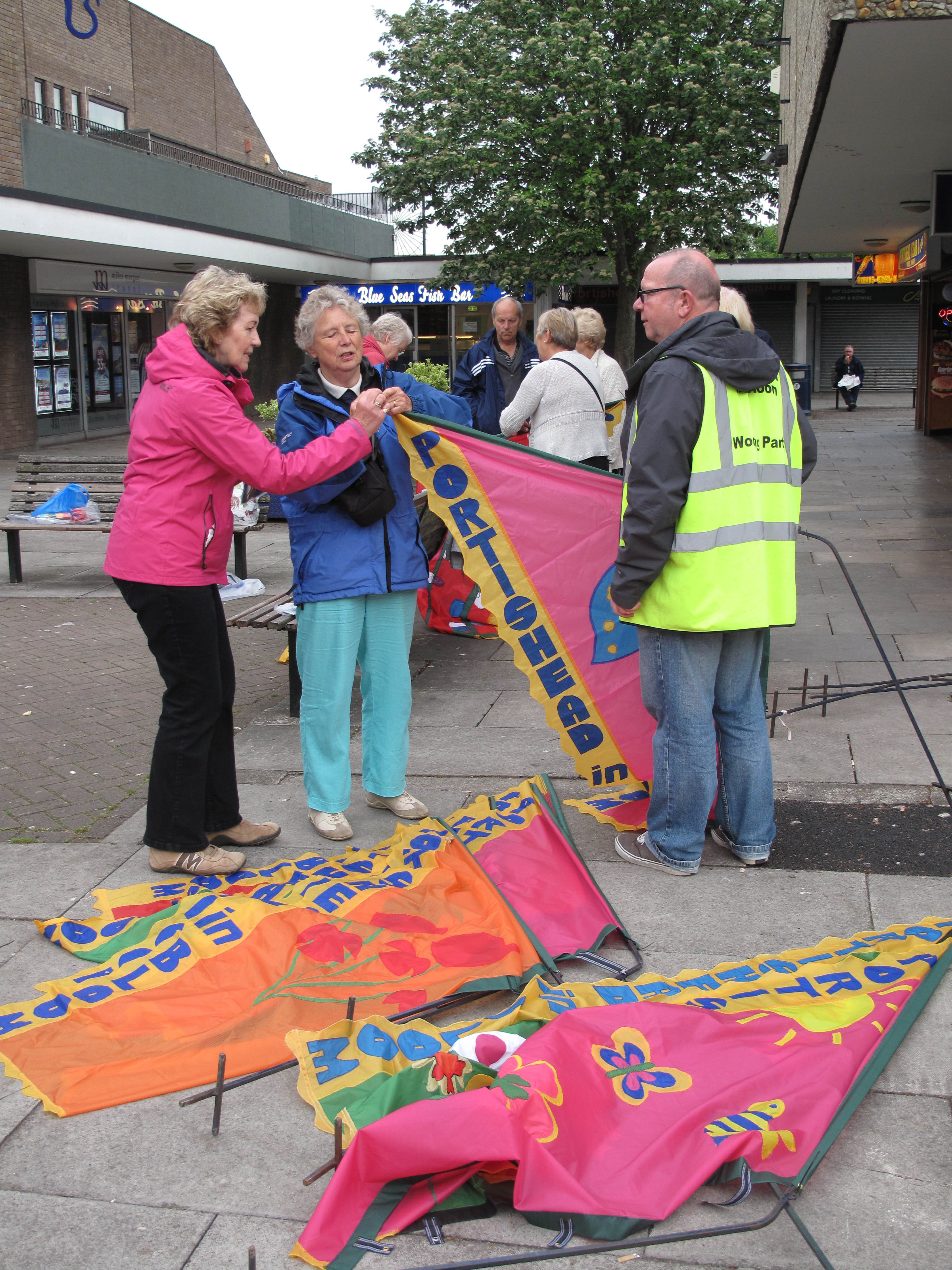 designs are from winning entries in a competition for primary school children in Portishead. Many thanks to the following volunteers who made the new flags: Susan and Bob Gidden, Cath Poole, Chris Girling, Christine Clark, Daisy Bickley, Anne Sterland, Barbara Waterhouse, Sandra Daniels, Heather Hardwidge, Linda Evans, June Hutchings, Rachel Bennett, Vera Saunders, Mavis Day, Lorainne Schneider, Jenny Jones, Amanda Willis, Pat Hingley, Yvonne Rowland, Wendy Mason-