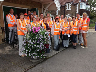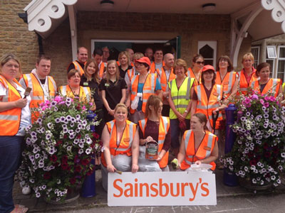 Volunteers from Sainsbury's formed a work party who painted and cleaned up the High Street for us prior to South West in Bloom judging. Photos show the volunteers outside the Folk Hall. Local children designed welcome posters for the judges.